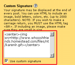 A custom signature is nice to have if you have an image or info about yourself or simply your name that you'd like to add to the bottom of each message. By making a custom signature, it will automatically add it for you without your having to type it in each time you leave a message. You'll find this option just below the Personal Icon area. It looks like this:
